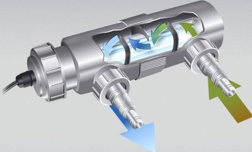 Наличие фильтра в этой конструкции обязательно — он позволяет очистить поступающую смесь от самых крупных частиц. Это могут быть как останки перегнивших растений, так и большие фракции аквариумного грунта, которые находятся в изменённой воде в качестве взвеси. Таким образом, попадающая под излучение вода избавляется от большинства заметных загрязнителей, а микробиотическая часть удаляется как раз лампой.