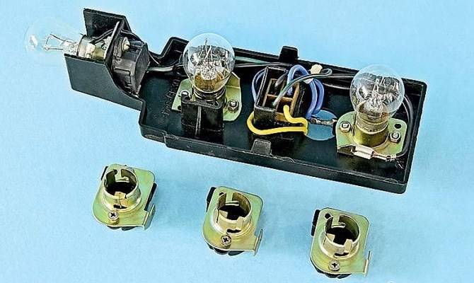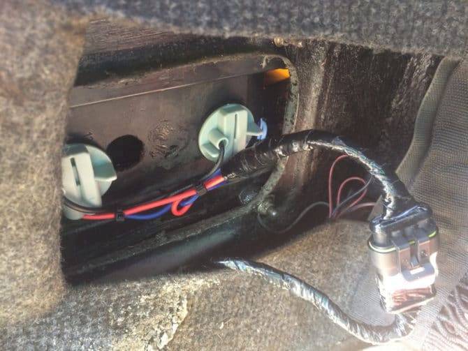 О том, где какая лампочка, мы уже говорили. Односпиральная сбоку – указатель поворотов. Две двухспиральные – одновременно и габариты, и стопы. Снимаем сгоревшую, устанавливаем новую. Защелкиваем плату на место, подключаем колодку, закрываем клапаном в обивке.
