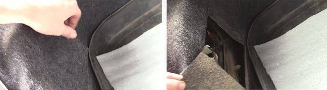 Снова открываем крышку багажника и находим на обивке клапан, закрывающий заднюю часть фонаря. Он на «липучке» и легко открывается. Открываем.