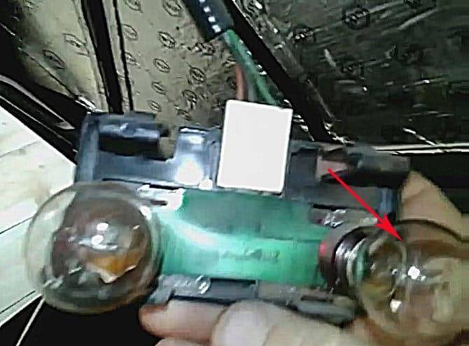 Снимаем лампочку, которую нужно заменить (назначение лампочек на первом фото статьи). Для этого поворачиваем патрон против часовой стрелки на 90 градусов, и он легко выйдет вместе с лампочкой.