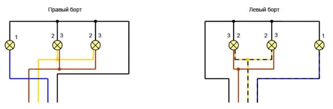 Совершенствуя транспортное средство отечественного производства, необходимо помнить о необходимости подцепить провода, идущие к внутренней шпильке расположенного с левой стороны фонаря, а также наружной шпильке правой оптики