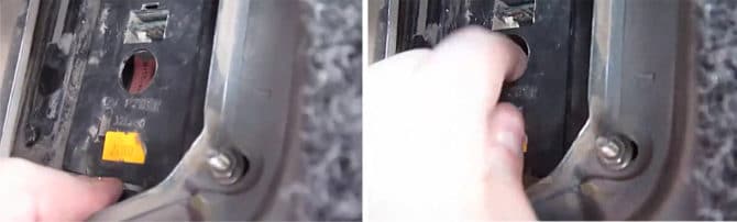 Та, что находится ближе к борту машины – лампочка заднего хода, ближе к центру – противотуманный свет. Поскольку на фото ниже фонарь правый, лампа указателя заднего хода находится справа. Она отмечена красной стрелкой.