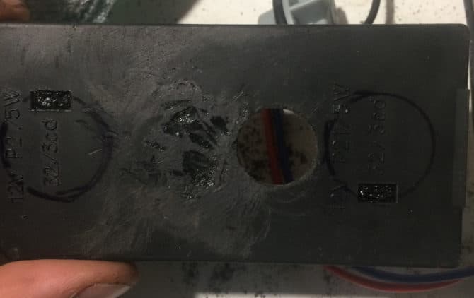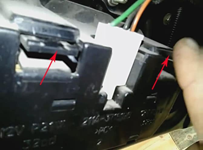 Из задней части фонаря торчит колодка питания