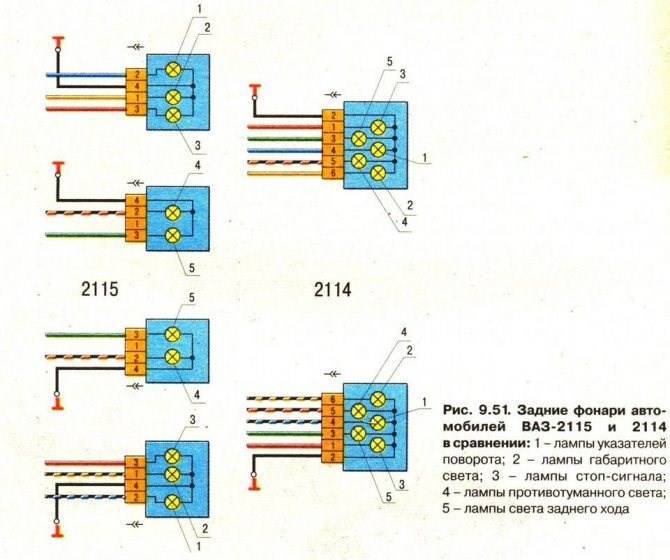 Схема внутренних задних фонарей ВАЗ 2115 и расцветка проводов жгута питания