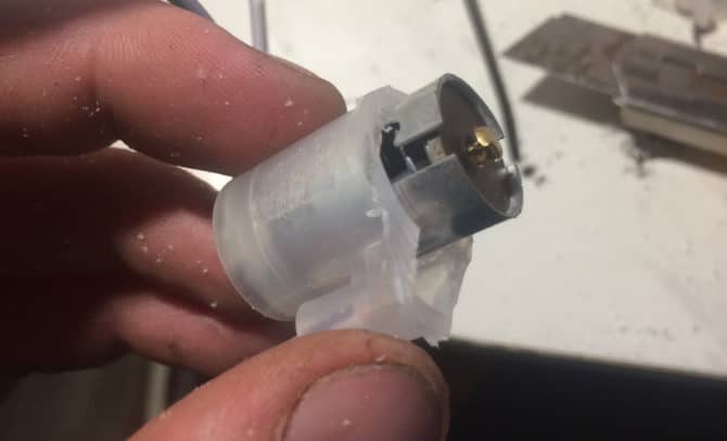 Перед нами задняя часть фонаря с торчащим из нее разъемом питания.