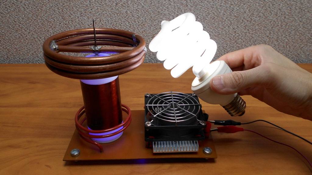 Как видно из схемы выше, резонанс обеспечивает индуктивность катушки. Конденсатор подключен параллельно к обмотке. Энергия будет перемещаться назад и вперед между магнитным полем, окружающим катушку и электрическим полем вокруг конденсатора. Здесь потери на излучение будет минимальными.