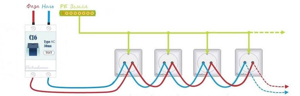 - шлейфом, в этом случае на отдельную линию параллельно устанавливается группа розеток (при этом соединение каждого из контактов розетки, в том числе защитный ноль, получается последовательным с аналогичным контактом остальных розеток).