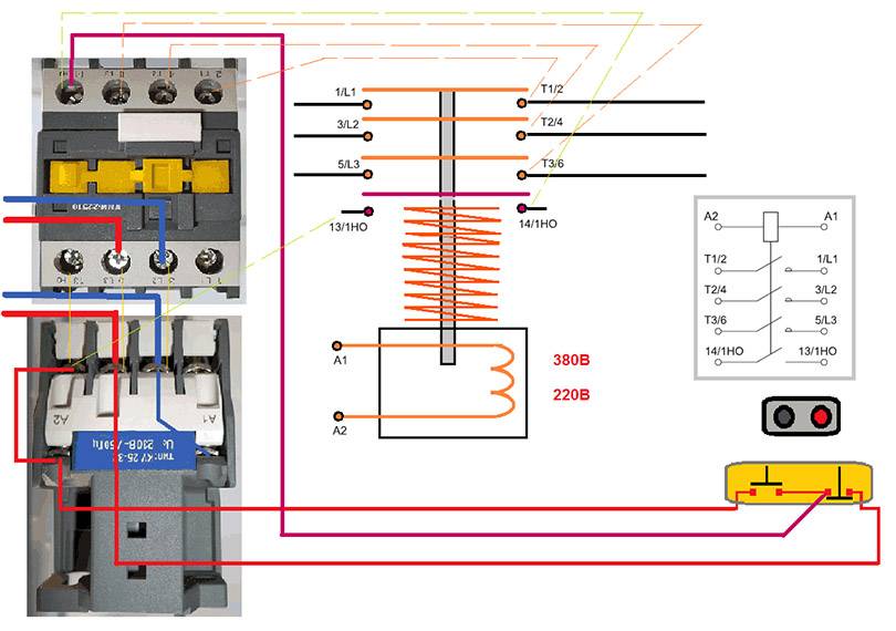 Контактор производит аналогичные подключения, как и пускатель, только электропотребители имеют большую мощность, соответственно и размеры у контактора значительно больше, и контакты у контактора значительно мощней. Принцип схемы базируется на электромагнитной индукции используемой катушки с вспомогательными и рабочими контактами.