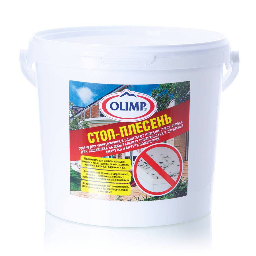 - Стоп-плесень (Олимп) — очень эффективное бесцветное средство, пригодное для кирпичных стен, оштукатуренных, шпаклеванных поверхностей.