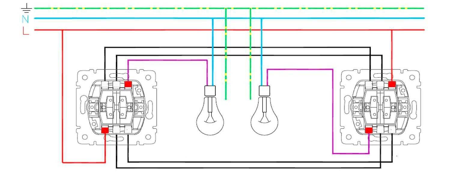В отличие от стандартного двухклавишного выключателя в проходном нет положения «включено» и «выключено». Из-за иного принципа работы механизма, в нем каждая клавиша управляет перекидным контактом, то есть происходит подача напряжения на один отходящий контакт и одновременное отключение питания от другой отходящей клеммы. Два двухклавишных устройства управляют двумя различными лампами/группами светильников с двух различных мест помещения.