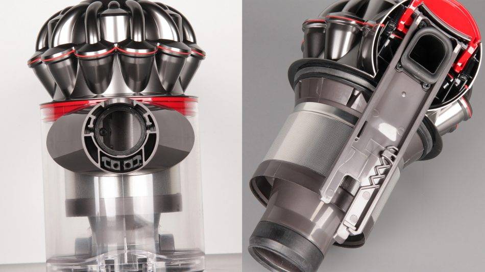 Эффективная очистка воздуха возможна только при герметичности внутри сепаратора. Удаление отложений из нижней камеры аккумуляторного пылесоса Dyson V8 происходит с одновременной очисткой стенок резиновым кольцом, которое приводится в движение рычагом. Опорожнение грязевика над приемником выполняется открытием нижней крышки, при нажатии на кнопку.