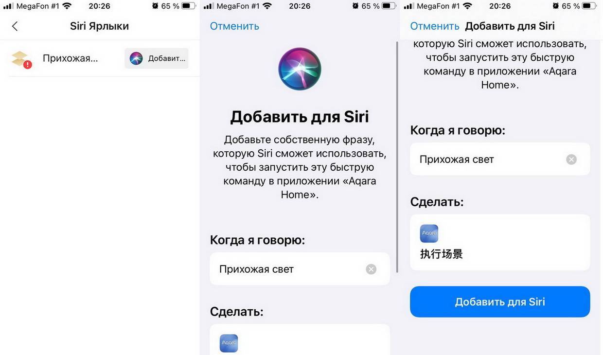 1. Создать в приложении Aqara Home -> Сценарий -> «+» в правом верхнем углу необходимую последовательность действий.2. Активировать переключатель Включить автоматизацию, установив метод запуска.3. Через иконку Siri в настройках созданного сценария создать управляющую фразу.