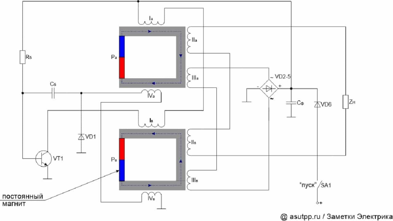 От протекающего магнитного потока в катушках II, III, IV наводится ЭДС. Электрический потенциал от IV катушки подается на базу транзистора VT1, создавая управляющий сигнал. ЭДС в катушке III предназначена для поддержания магнитного потока в магнитопроводах. ЭДС в катушке II обеспечивает электроснабжение нагрузки.
