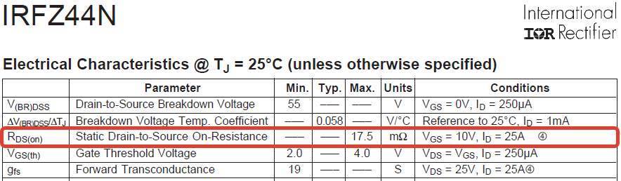 Для того, чтобы узнать характеристики транзистора, нам надо открыть на него даташит и рассмотреть небольшую табличку на первой странице даташита. Будем рассматривать транзистор, который мы использовали в своих опытах: IRFZ44N.