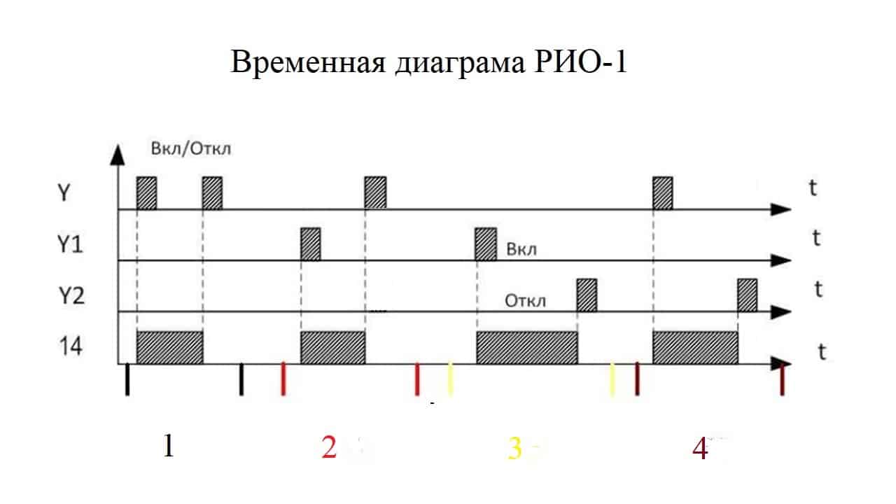Отличительной особенностью РИО-1 является разрыв силовой цепи только при переходе синусоиды переменного напряжения через ноль, что существенно повышает срок службы контактной группы. Но при этом время срабатывания отличается на 0,3 с, что необходимо учитывать для проектирования точных электронных схем. Функционирование импульсного реле через подачу сигналов на каждый ввод хорошо отображается на временной диаграмме устройства (смотрите рисунок 3):