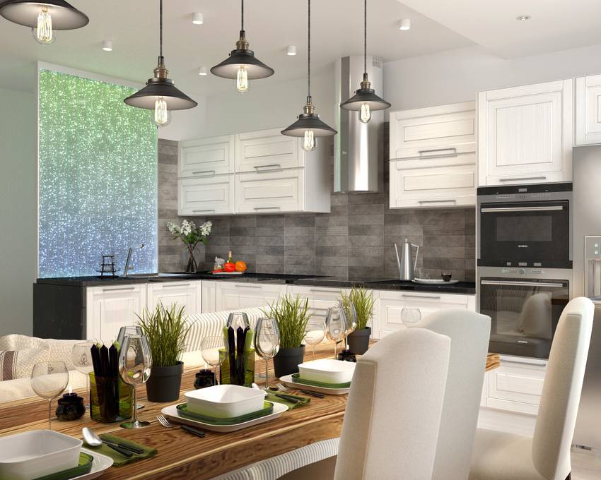 Для просторной кухни, которая совмещена с гостиной, хорошим вариантом станет организация встроенного точечного освещения, который не только будет озарять обеденную зону, но и станет элементом разделения пространства. В современном интерьере интересно выглядит шинная система с несколькими светильниками с поворотной конструкцией над обеденной зоной. Это наиболее предпочтительный вариант для раскладных столов, поскольку поворотные осветительные системы позволяют скорректировать направление потока света.
