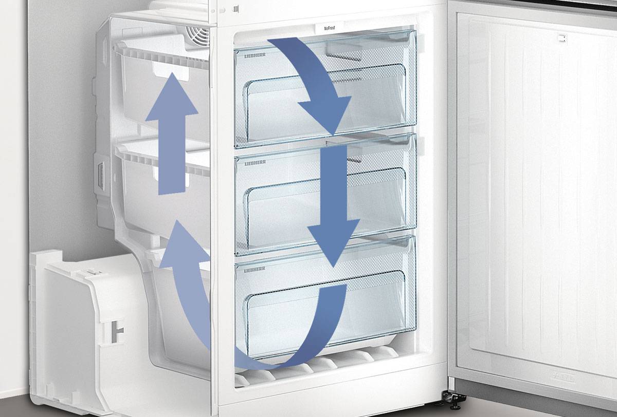 Многие современные холодильники оборудованы особой системой заморозки No Frost, препятствующей образованию наледи внутри морозилки. Подобный эффект дает инновационная техника вентиляции, оптимально распределяющая воздушные потоки внутри агрегата. Движение воздуха убирает со стенок весь конденсат, и они всегда остаются чистыми.