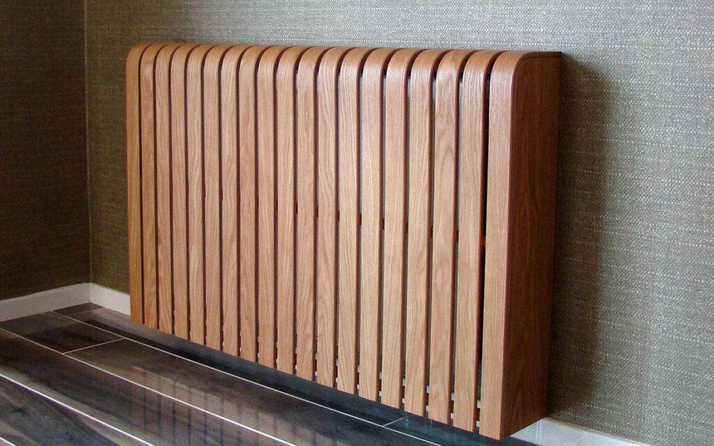 деревянные экраны выглядят красиво. Их делают с использованием реек, размещая вертикально или горизонтально. Тем самым удается оставить зазоры для сохранения теплообмена. Есть одно «но»: деревянные коробы лучше не использовать в помещениях с повышенной влажностью, как кухня и ванная. А вот в гостиной, детской, спальне они будут уместны;