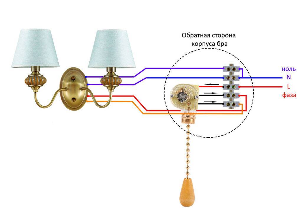 стены идет напрямую на нулевой провод бра. Фазу из стены соединяем с одним из