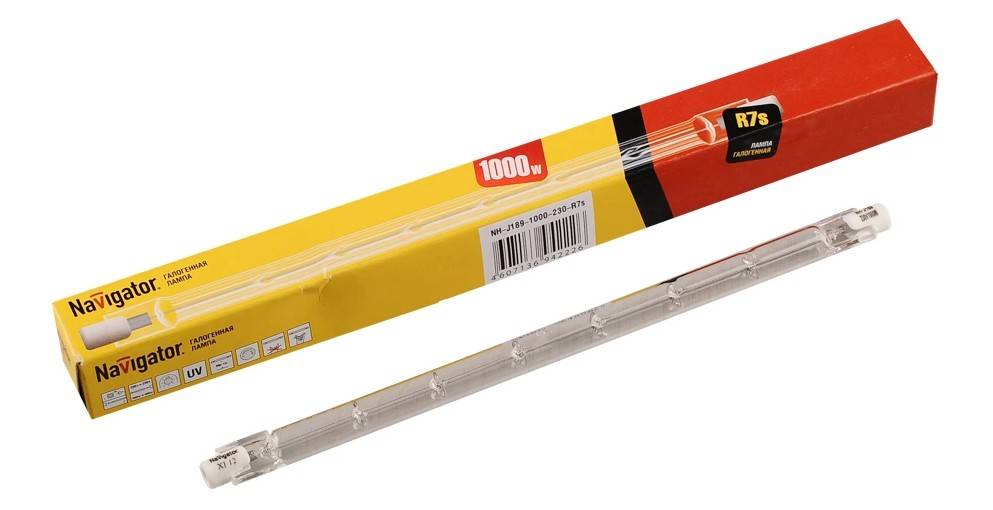 Обозначается буквами R7s? 7 — это диаметр отверстия. Цифры после букв указывают на общую длину лампы в мм, выпускают такие лампы длиной 78, 118, 189, 254 мм. Применяются в различных кварцевых приборах и приборах с высокой интенсивностью освещения.