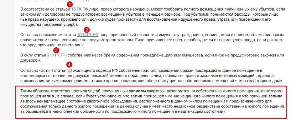 Многие задаются вопросом – что делать, если затопили соседей снизу. Необходимо изучить законодательную базу по данному вопросу. Основным нормативным правовым актом, регулирующим данный процесс, является Гражданский Кодекс РФ. Именно в нем указано, что лицо, причинившее вред, обязано его возместить.