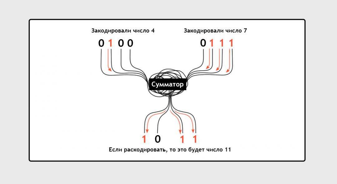 Допустим, нам надо сложить числа 4 и 7. Нам, людям, очевидно, что результат будет 11. Закодируем эти три числа в двоичной системе: