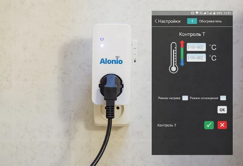 Максимальная мощность – 3,5 кВт. Alonio T6 включает и деактивирует бытовые приборы при достижении заданных градусов. В умной розетке предусмотрели опцию прямого контроля. Человек дистанционно может отключить любую технику, которая подсоединена к гаджету.