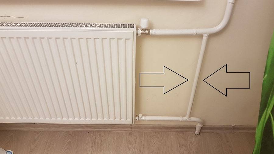 Подвод труб к батарее в однотрубной системе легко спрятать в пол или стену, чтобы помещение выглядело эстетично