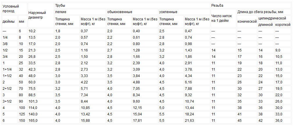 Стандартные диаметры стальных труб на таблице с толщиной стенки и массой регулирующимися ГОСТ. (Для водопроводных труб.)