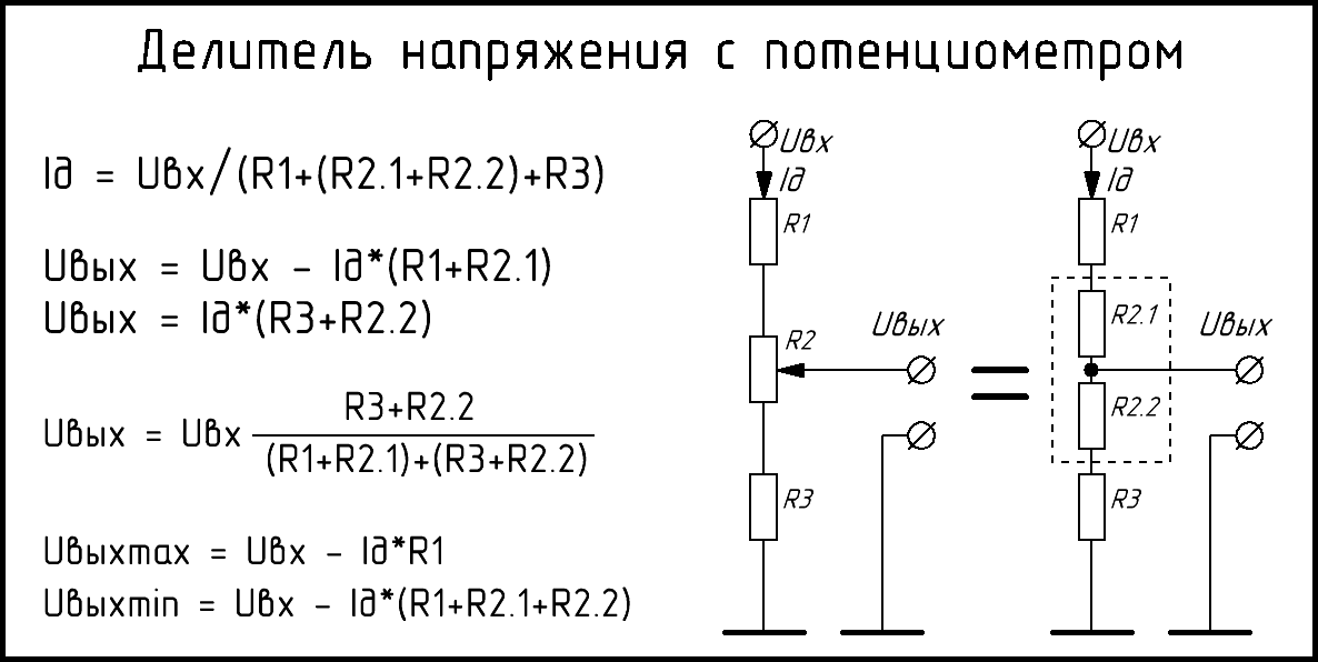 На первый взгляд эта разновидность делителя кажется сложной, а формулы и вовсе отпугивают. Однако подстроечный резистор, включённый по схеме потенциометра, делает схему очень предсказуемой. Сопротивление R2 всегда постоянно, поэтому ток делителя не меняется, и высчитать диапазон регулировки напряжения очень просто.