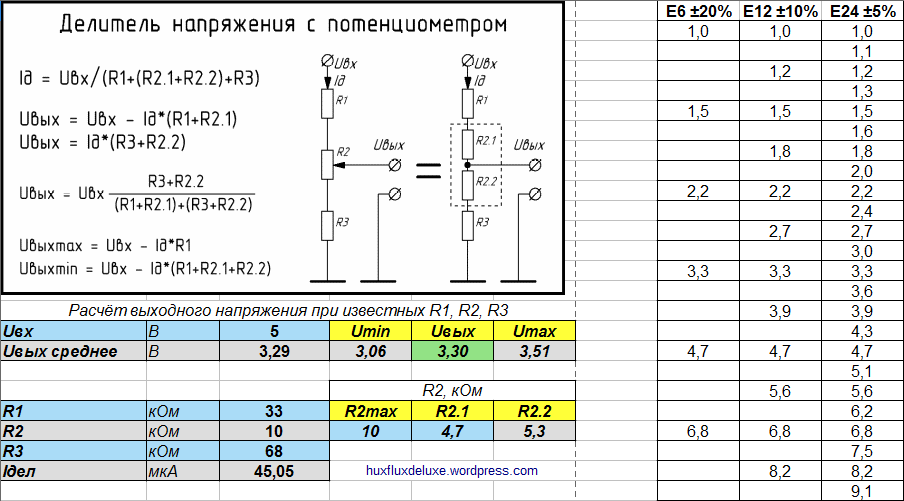 Калькулятор построен так, что после расчётов можно распечатать его страницу со всеми результатами. Если вдруг понадобится пересчитать делитель — есть формулы на картинке. Справа висит таблица стандартных номиналов радиодеталей — чтобы вы не кошмарили магазины мифическими резисторами на 77 кОм.Инструкция: 1. Задать входное напряжение Uвх. 2. Установить R2max и R2.1 в нули. R2.2 обнулится автоматически. 3. Подобрать такие R1 и R3, чтобы Uвых среднее было близким к нужному. 4. Для точной регулировки укажите максимальное сопротивление подстроечного резистора R2max. 5. Калькулятор выдаст диапазон регулировки (Umin, Umax) и текущее значение Uвых. Последнее можно менять, увеличив сопротивление R2.1. 6. В реальную схему вместо потенциометра можно поставить постоянные R2.1 и R2.2 рассчитанных номиналов.