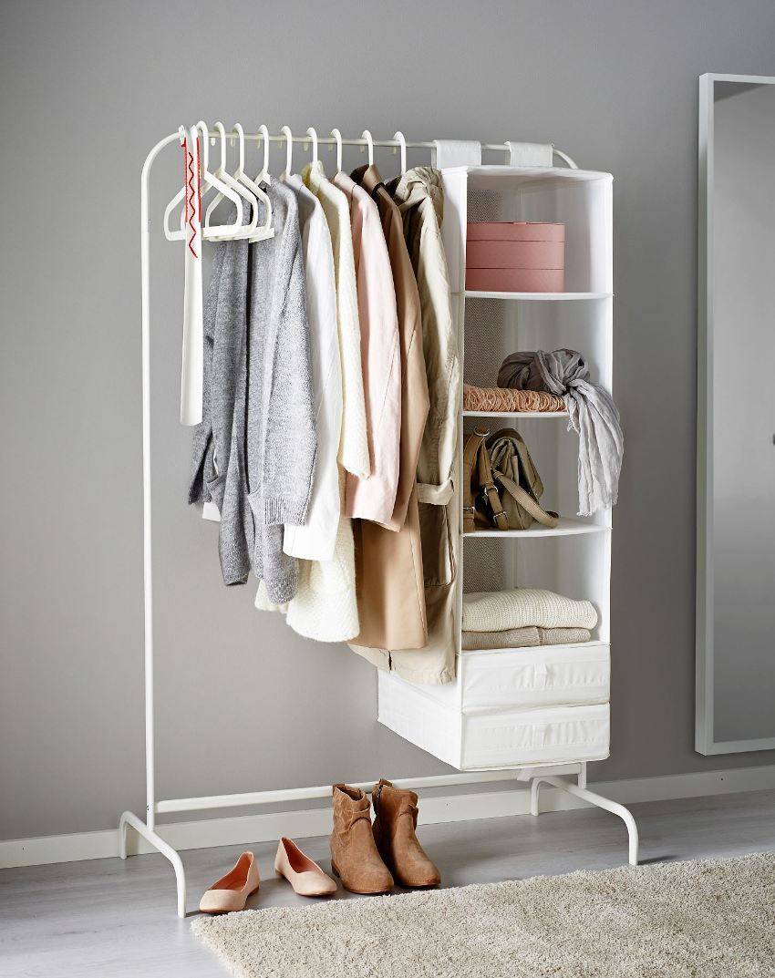 Также очень популярна обычная перекладина с плечиками на колесиках. Это очень практичный и удобный вариант и подойдет практически всем.