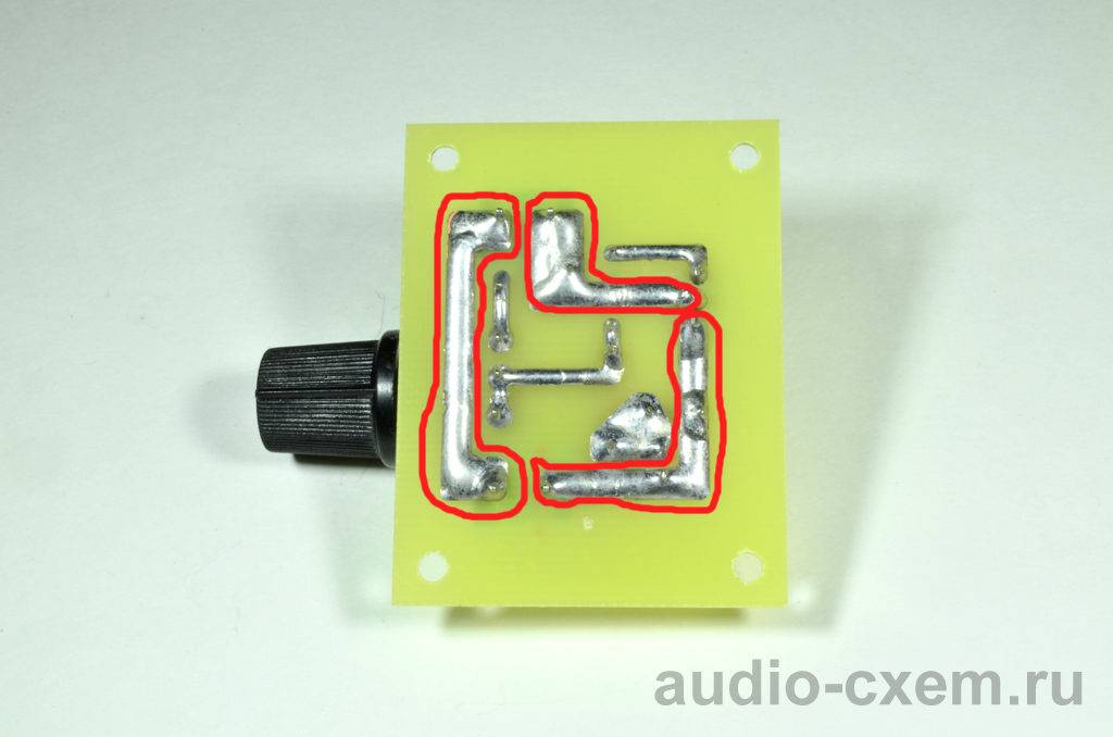 Для исключения нагрева силовых дорог печатной платы, при работе на большую мощность (более 1кВт), следует дорожки покрыть толстым слоем олова или пропаять медным проводом.