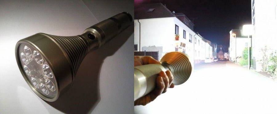 В Германии (Франкфурт) был изготовлен самодельный светодиодный фонарь с мощностью светового потока 18000 люмен! Он настолько яркий, что способен запросто выжечь сетчатку глаза.