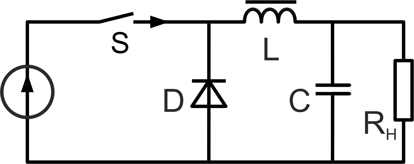 Схема импульсного стабилизатора, приведённая ниже, также работает на основе дросселя, однако дроссель всегда подключен к выходу источника питания. Когда ключ разомкнут, питание поступает через дроссель и диод на нагрузку. Когда ключ замыкается, дроссель накапливает энергию, когда ключ размыкается, возникающее на его выводах ЭДС добавляется к ЭДС источника питания и напряжение на нагрузке возрастает.