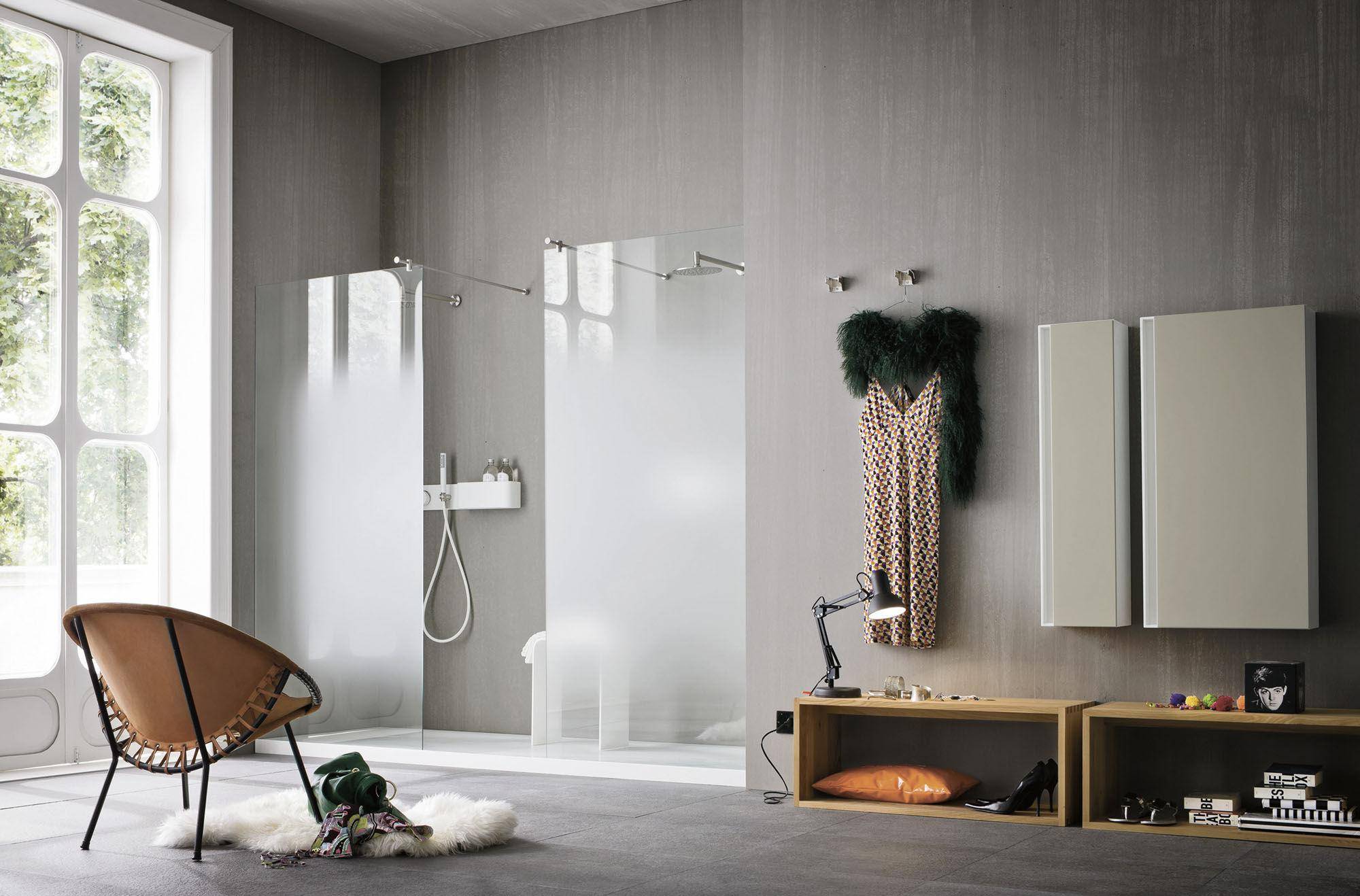 Особенность этой конструкции заключается в том, что душевая зона никак не отделяется от остальной ванной комнаты. Фактически душевая кабинка располагается в углу комнаты и не имеет какого-либо отдельного подиума.