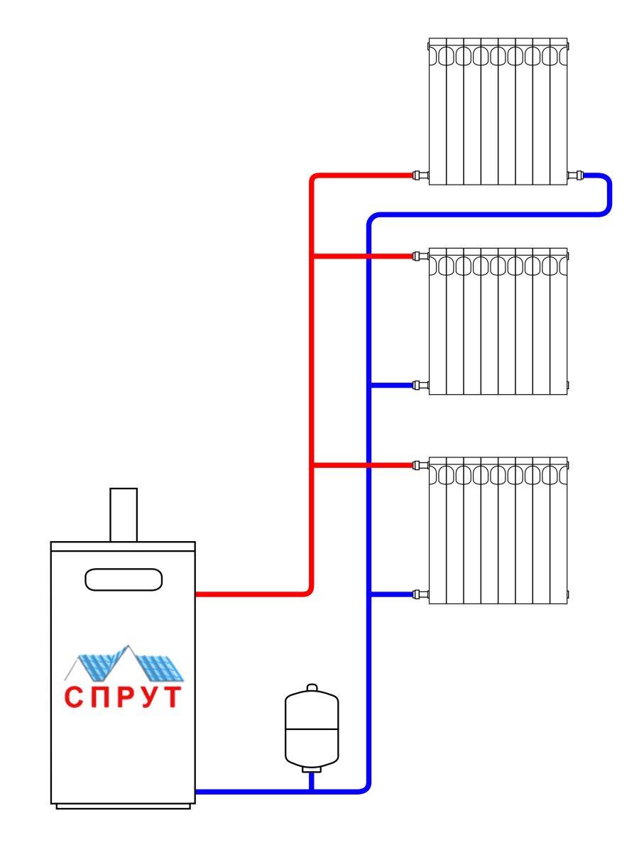 При такой схеме радиатор обслуживается двумя трубами — подачей и обраткой, поэтому система называется двухтрубной.