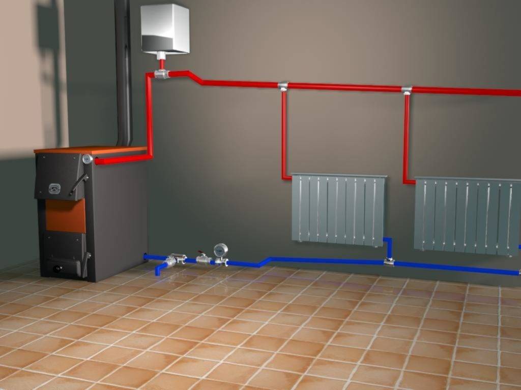 Воздух в такой системе поднимается вверх, где-либо выходит через бак, либо спускается с помощью вентеля. Удобны в эксплуатации и установке. В вертикальных системах чаще используют естественную циркуляцию теплоносителя.