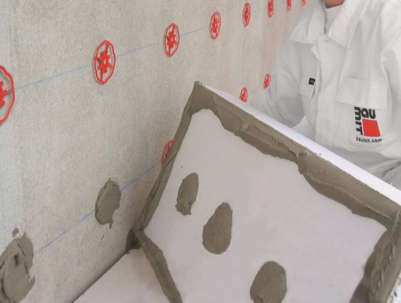 - Установка утеплителя. Работа ведется снизу вверх, клей наносится на заднюю поверхность ППС по всей площади (если применяется спецклей — по периметру и несколько полос в центре). Рекомендуется дополнительно крепить листы утеплителя дюбелями с широкой шляпкой.