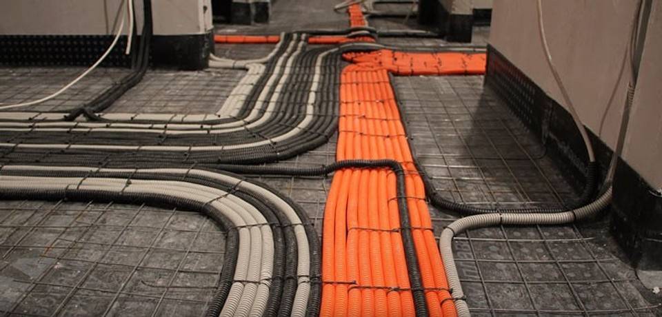 Это скрытая проводка, не требующая штробления. Кабели в трубах укладываются в стяжку, что считается надежнее прокладки по стенам.