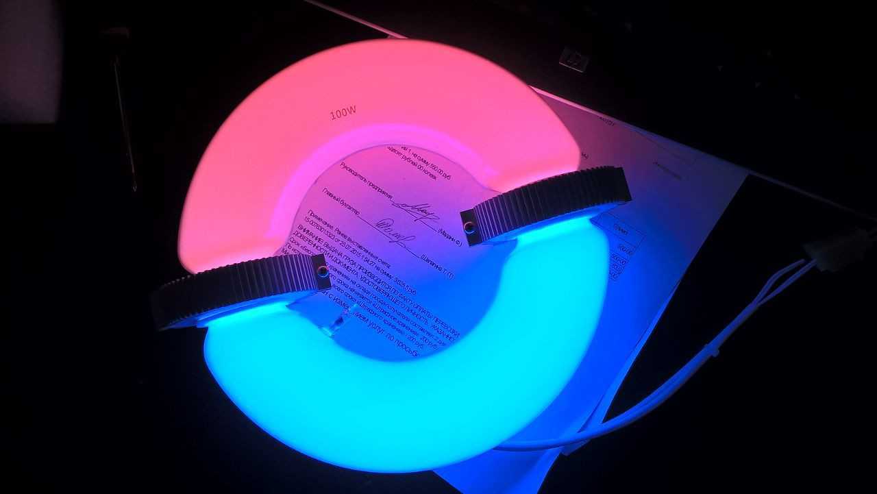 Снабжен светильник светодиодами синего и красного оттенков и может
