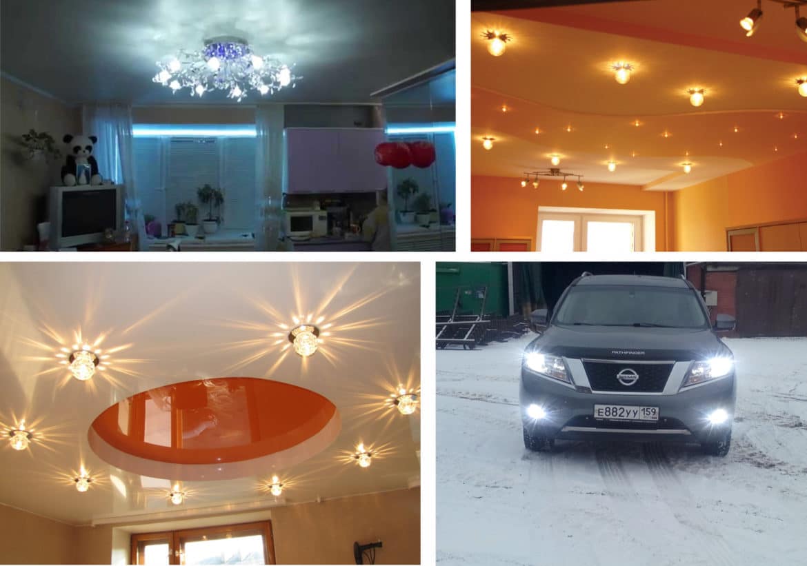 Галогенная лампочка – прибор универсальный, который можно использовать практически везде и для любых целей. Миниатюрные лампочки успешно работают в фарах транспортных средств: от велосипедных фар до самолетных прожекторов. Их устанавливают в точечные светильники для локального и общего освещения квартир и производственных помещений. Лампы с дополнительной внешней колбой отлично работают в люстрах и бра.