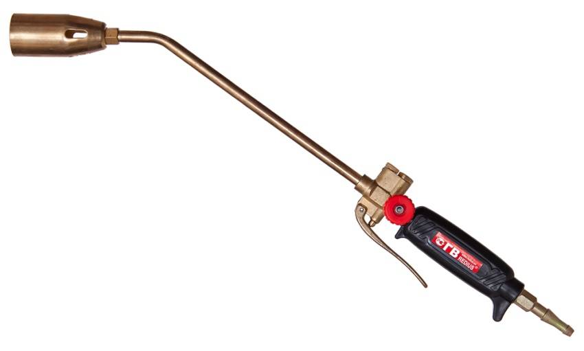 - ГВ-850 – горелка, имеющая особый вентиль, благодаря которому можно с высокой точностью регулировать количество подачи технического газа из баллона. Также здесь установлен рычаг, с помощью которого мастер корректирует длину факела. Данная газовая горелка работает не на чистом пропане, а на смеси, в составе которой содержится технический кислород. Цена газовой горелки для кровли ГВ-850 – 1700-2200 руб.