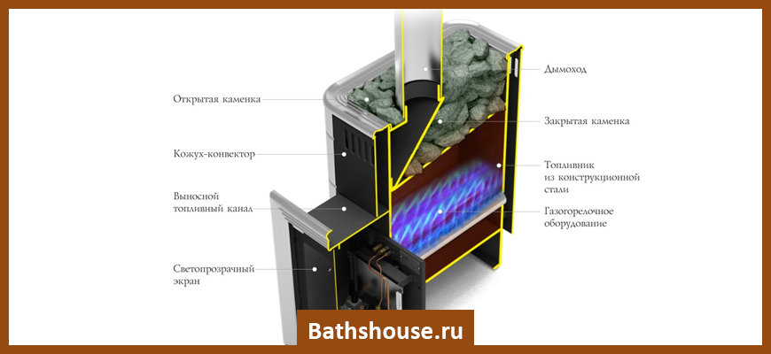 - Бак встроенный. Емкость для воды изготавливается из нержавейки. При сгорании дров одновременно разогревается жидкость, камни. Из-за того что бак встроенный, он ограничен по размеру.