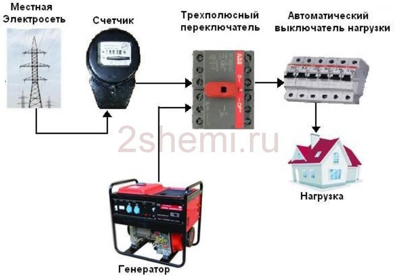 На рисунке общая схема подключения генератора к дому с автозапуском – принцип ее работы следующий.