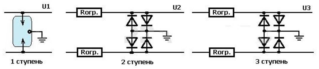 Цепочка разрядников осуществляет «грубое» ограничение напряжения. Первый разрядник подключается между центральной жилой кабеля и корпусом устройства, второй разрядник «сбрасывает» напряжение с корпуса прибора на провод заземления. Полное ограничение импульсов высокого напряжения осуществляется цепочкой из резистора и стабилитрона. Безопасный, ограниченный сигнал подается со стабилитрона на подключаемое устройство.