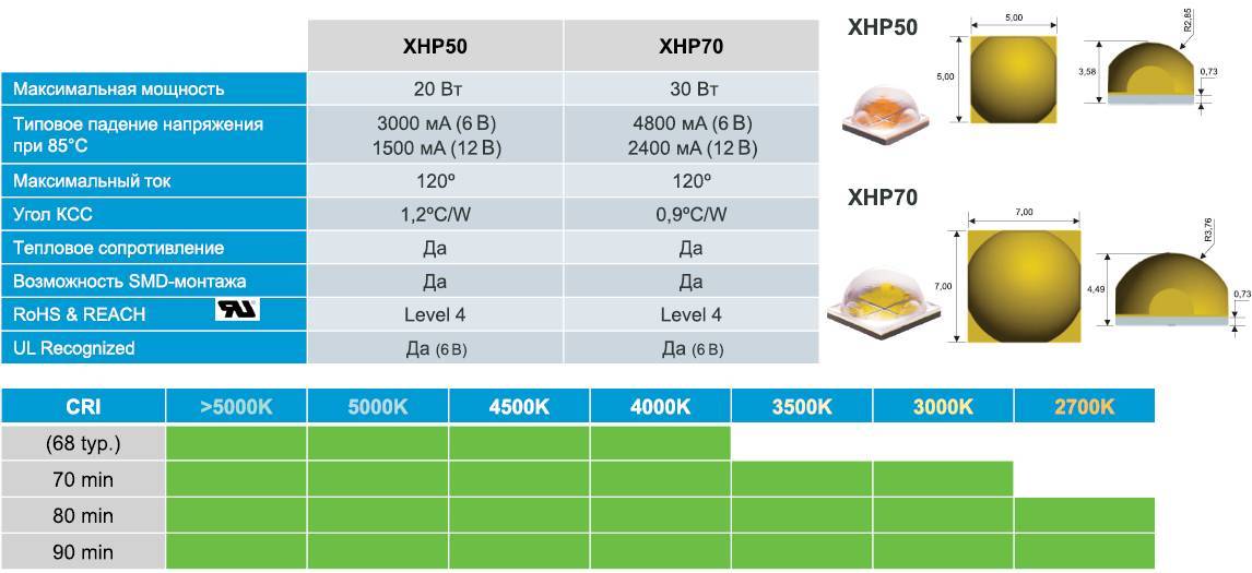 Сравнение и характеристики светодиодов CREE XHP70 и XHP50