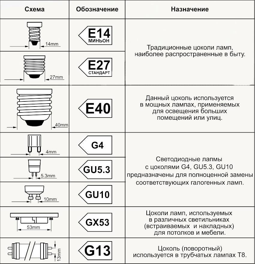 Типы цоколей ламп