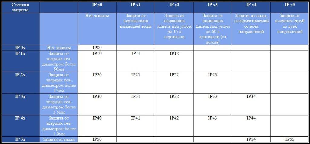 Выключатели разделяются: по типу, виду, каждый тип имеет свои способы применения. И вот как раз в таблице ниже, мы видим их подразделение по степени защиты.