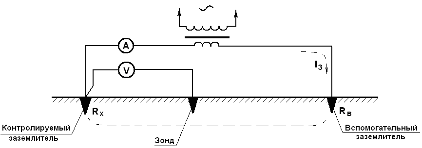 Чтобы провести замеры, создают электрическую цепочку, по которой ток протекает через проверяемое заземлительное устройство и токовый проводник (его также именуют вспомогательным электродом). В схеме присутствует еще и потенциальный электрод, задача которого состоит в измерении падения напряжения при протекании тока через заземлитель. Потенциальный проводник находится на участке с нулевым потенциалом — на равном удалении от вспомогательного электрода и проверяемой заземлительной системы.